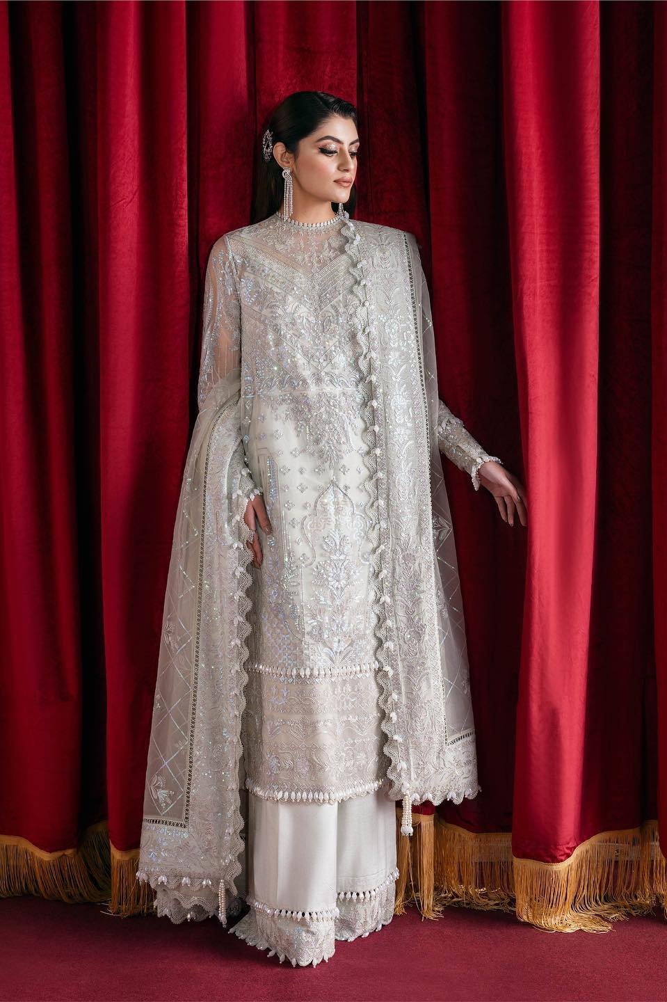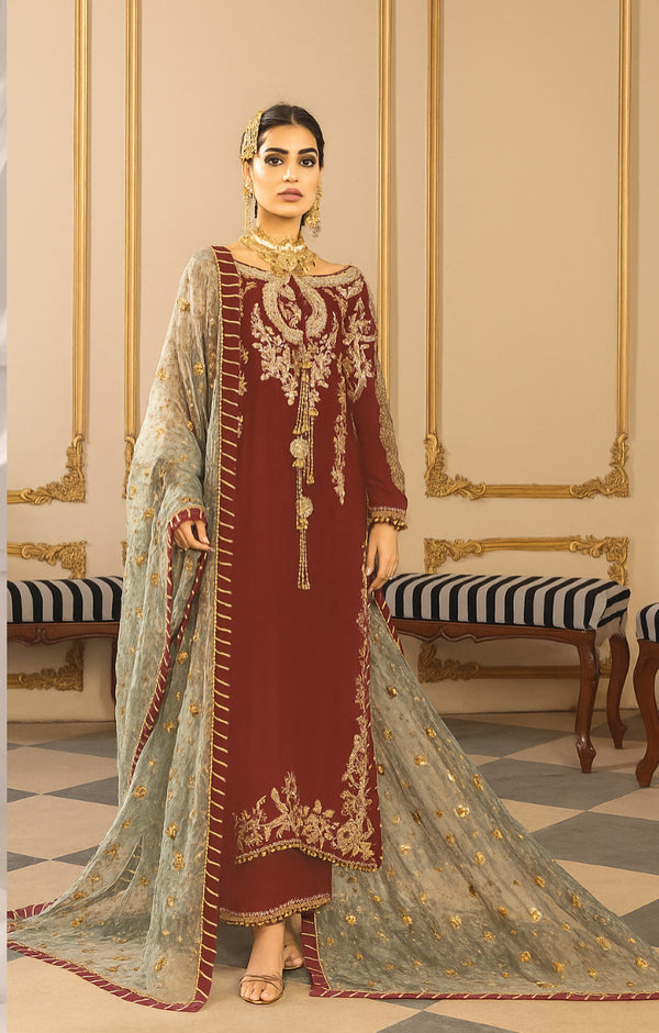 SHIRT: SHISHA SILK FRONT FRONT WITH HAND MADE NECK HAND MADE PEARLS AND HAND EMBELLISHMENT SHISHA SILK FULL EMBROIDED AND HAND EMBELLISHED SLEEVES SHISHA SILK EMBROIDED BACK FABRIC:SHISHA SILK DUPATTA:...