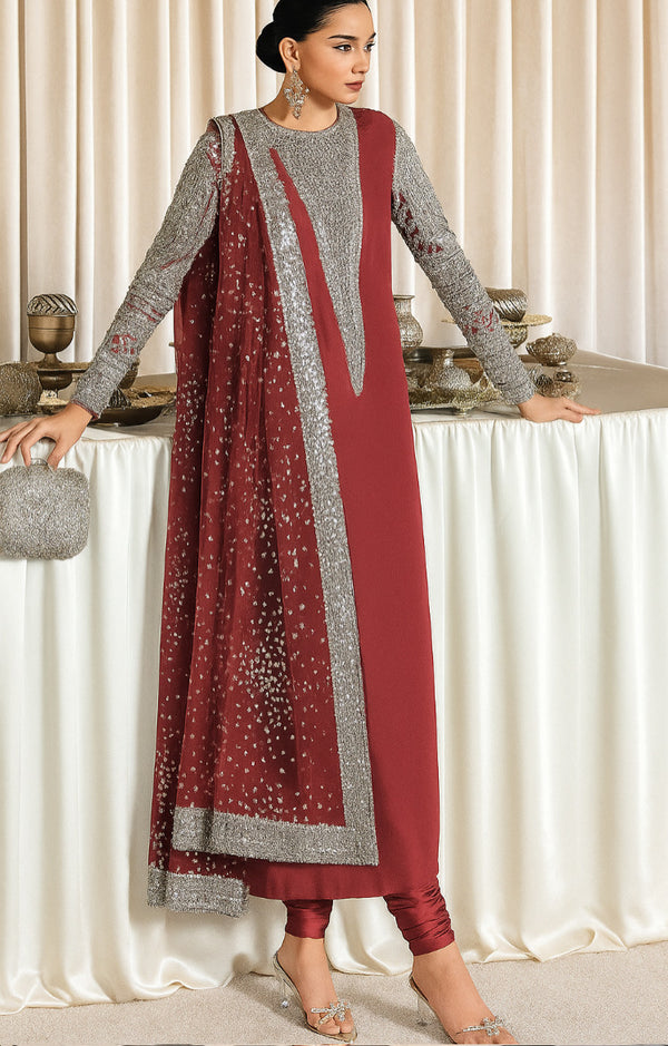 SHIRT: RAW SILK FRONT FRONT WITH NECK HAND MADE PEARLS AND HAND EMBELLISHMENT RAW SILK FULL EMBROIDED AND HAND EMBELLISHED SLEEVES RAW SILK EMBROIDED+ HAND EMBELLISHED BACK COLOUR: MEROON FABRIC:RAW SILK...
