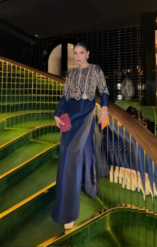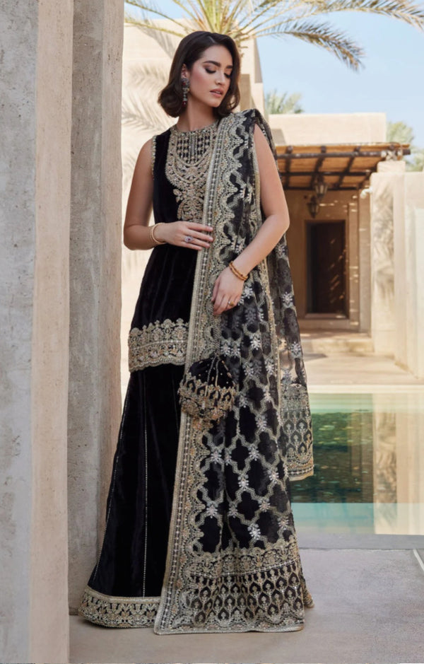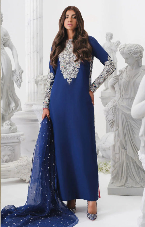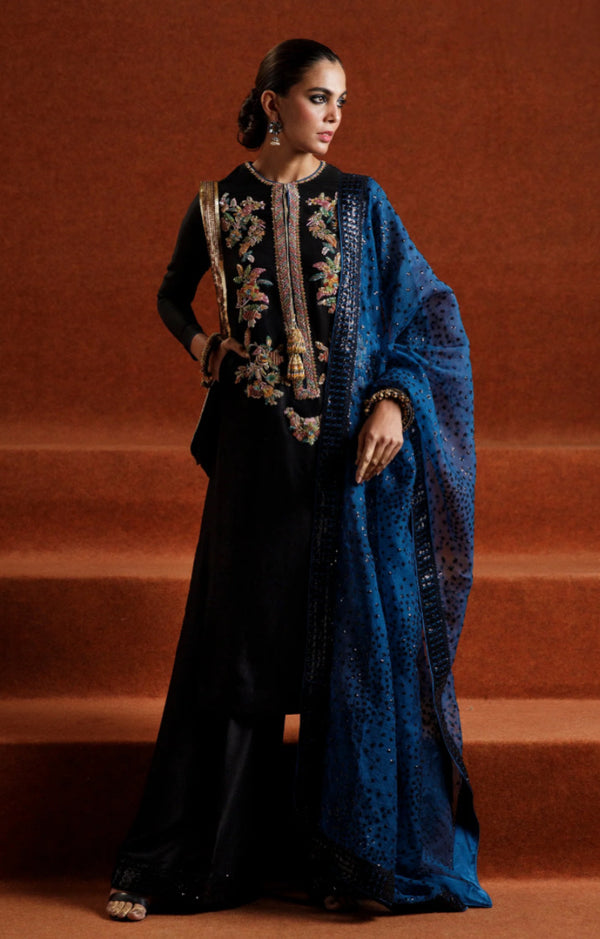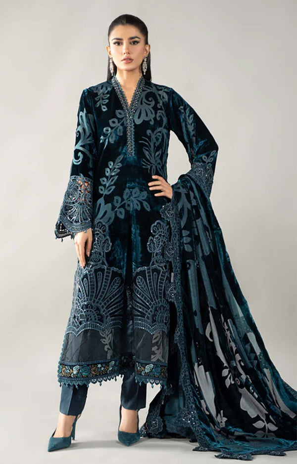 ShirtEmbroided Velvet Front Embroided Velvet Back Embroided Velvet SleevesColor: NAVYFabric: Velvet TrousersPlain Velvet Color: NAVYFabric: Velvet DupattaReady To Wear DuppataEmbroidered Velvet Cutwork StyleColor: NAVYFabric: VelvetNote: Dry Clean Only Note:Actual product color may vary...