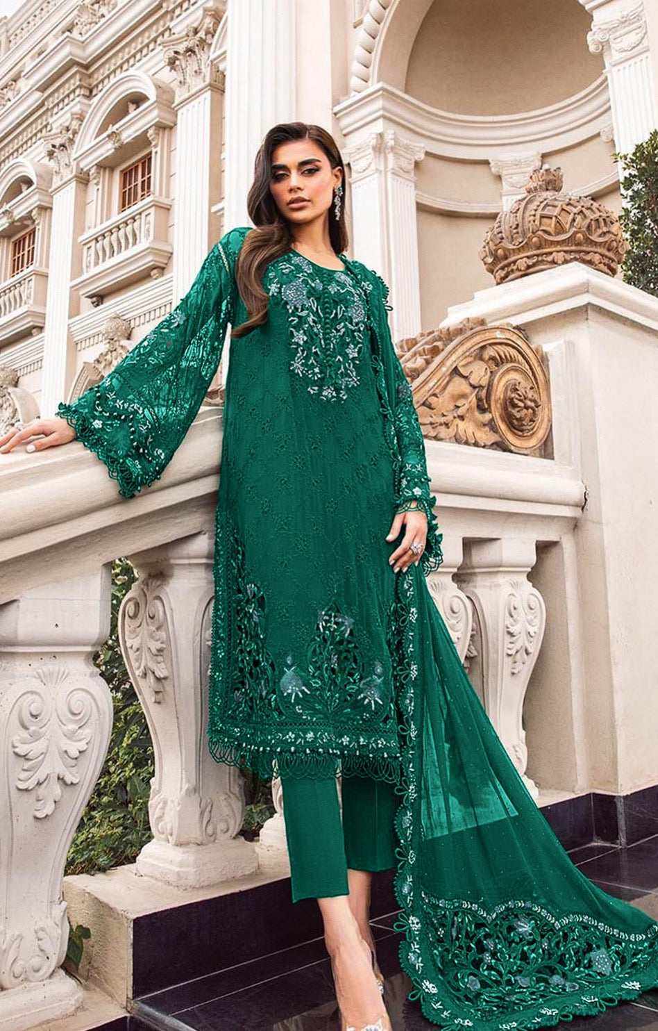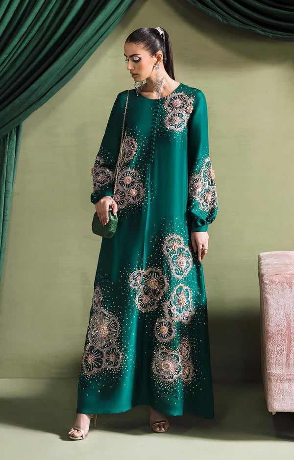ShirtEmbroidered Organza Neck patchOrganza Daman Patti Embroidered LAWN SleevesEmbroidered Organza Sleeves PattiDyed BackFabric: BANADORADupattaDyed Dupatta With DiamantesEmbroidered Organza Dupatta PattiFabric: PURE SHAFFONTrousersDyed TrouserFabric: BANADORAColor: EMERALD GREENNote: Dry Clean Only