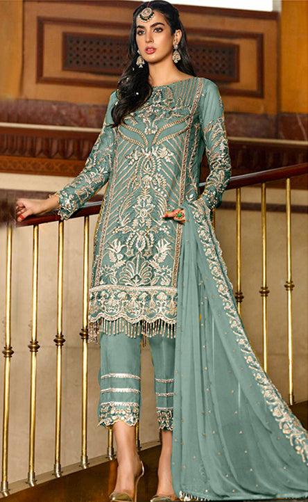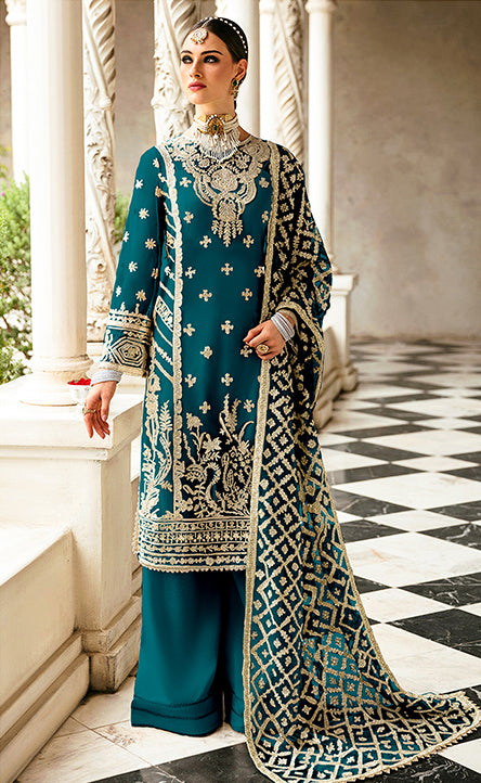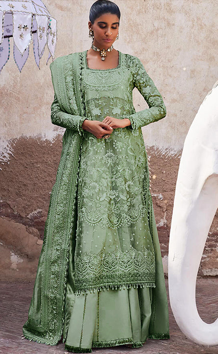 ShirtEmbroided Velvet Laser Cut Work Front Embroided Velvet Back Embroided Velvet SleevesColor: Sea GreenFabric: Velvet TrousersPlain Velvet Color: Sea GreenFabric: Velvet DupattaReady To Wear DuppataEmbroidered Velvet Color: Sea Green Fabric: VelvetNote: Dry Clean Only...