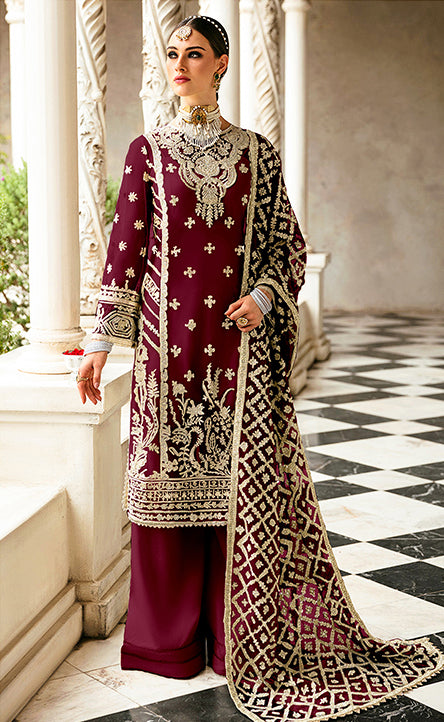 ShirtEmbroided Velvet Front Embroided Velvet Back Embroided Velvet SleevesColor: PurpleFabric: VelveTTrousersPlain Velvet Color: PurpleFabric: VelvetDupattaReady To Wear DuppataEmbroidered Velvet Cutwork StyleColor: PurpleFabric: VelvetNote: Dry Clean Only Note:Actual product color may vary...