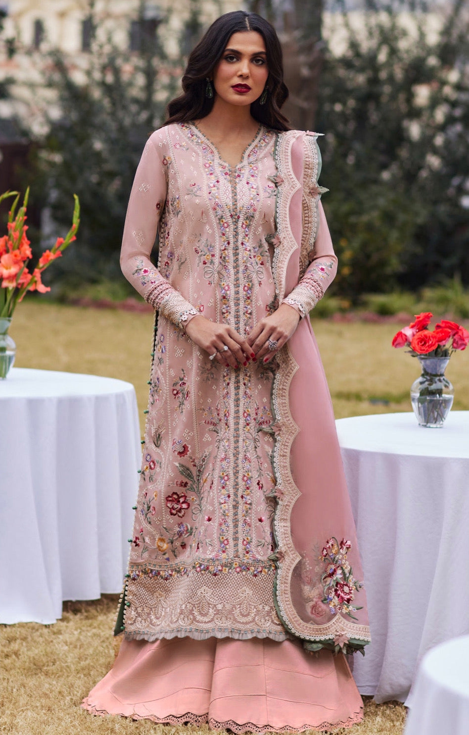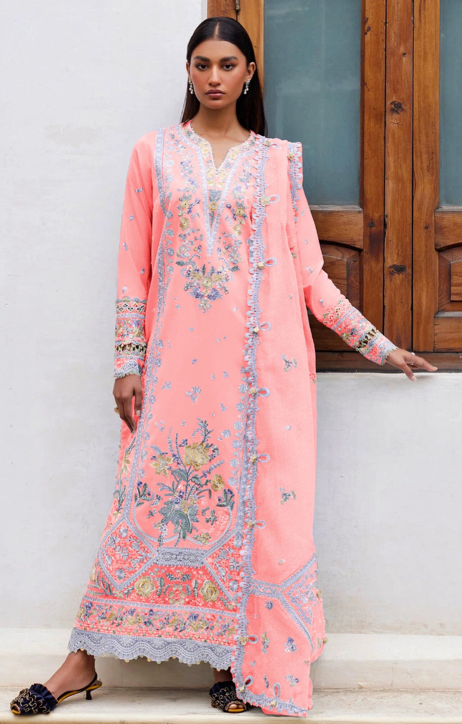 Shirt Embroidered CHIKANCARI BORING Lawn FRONTEmbroidered Organza Ghera Patch Embroidered Lawn Sleeves Left & RightEmbroidered Organza Sleeves PattiDyed Lawn BackDupattaEmbroidered Organza Dupatta PattiEMBROIDED KHAADI NET DUPPATA WITH BORDERS COLOUR: PEACHTrousersDyed LAWN...