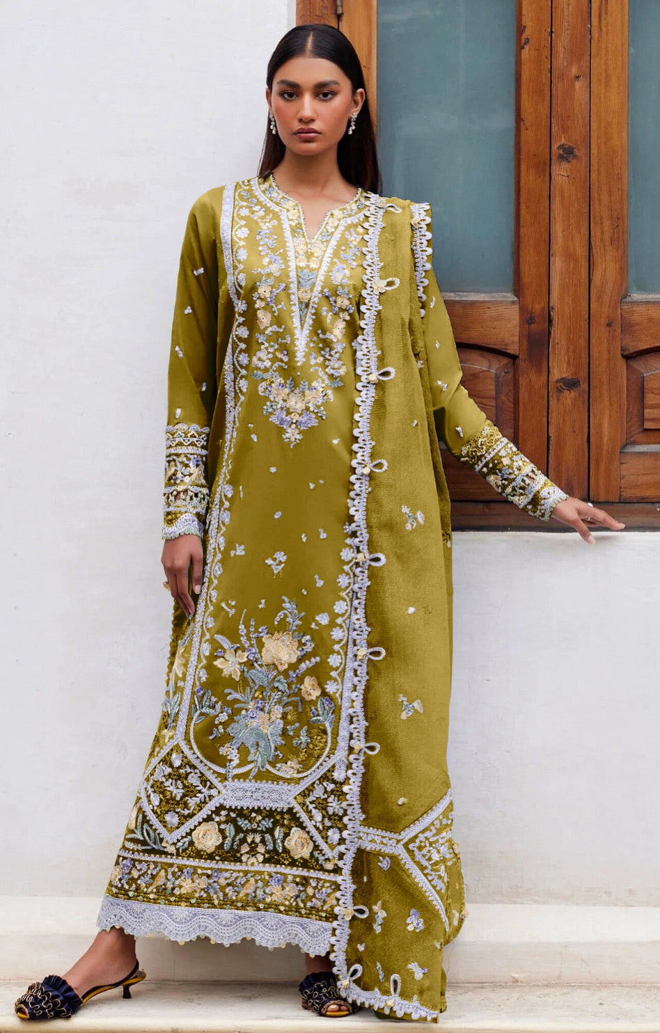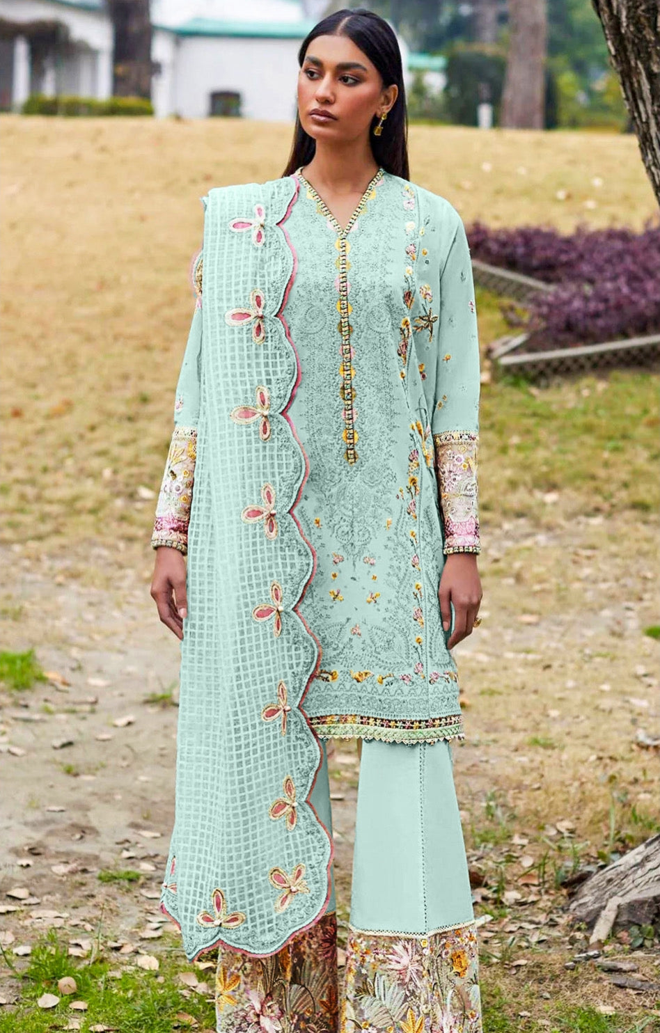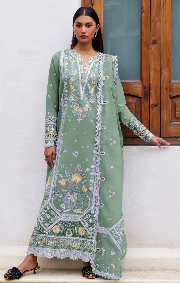 Shirt Embroidered CHIKANCARI BORING Lawn FRONTEmbroidered Organza Ghera Patch Embroidered Lawn Sleeves Left & RightEmbroidered Organza Sleeves PattiDyed Lawn BackDupattaEmbroidered Organza Dupatta PattiEMBROIDED KHAADI NET DUPPATA WITH BORDERS COLOUR: PISTA SONFTrousersDyed...