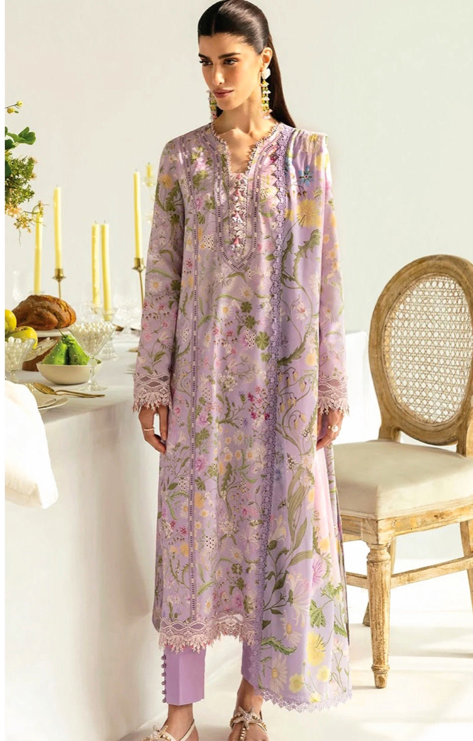 ShirtPrinted ShirtEmbroidered Organza PatchFabric: LAWNColor: LILACDupattaPrinted DupattaFabric: SHAFOON DUPATTAColor: LILACTrousers