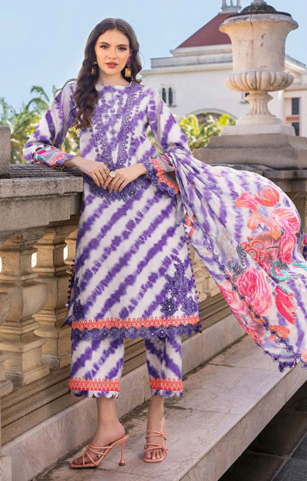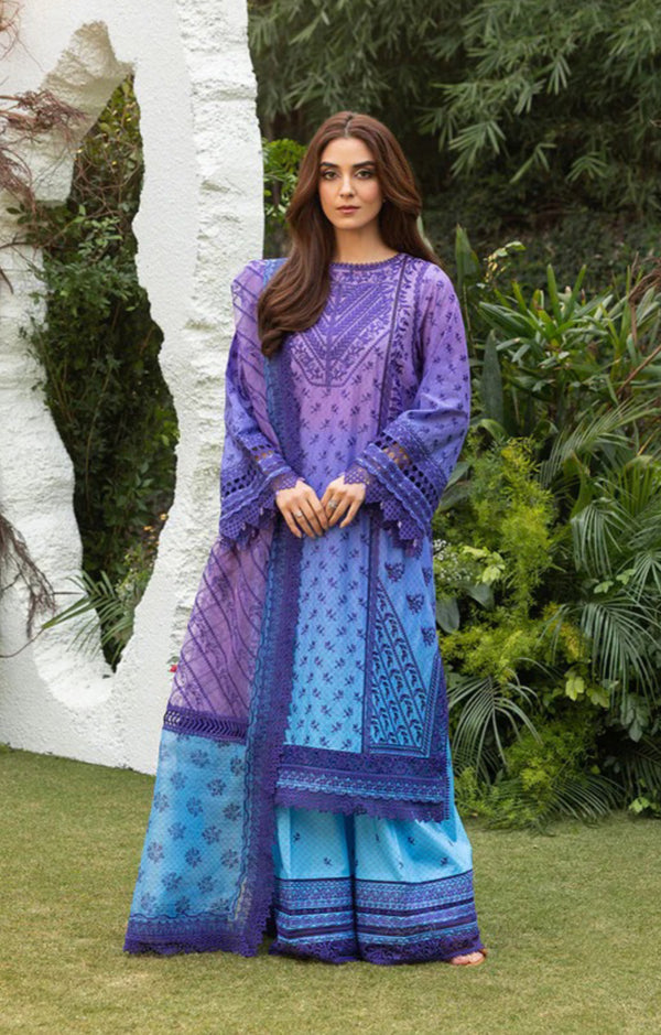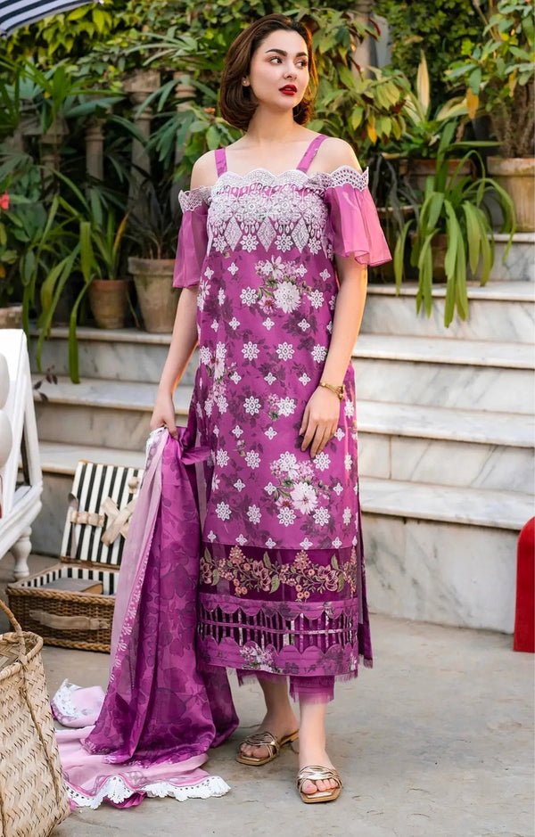 ShirtPrinted ShirtEmbroidered Organza PatchFabric: LAWNColor: PURPLEDupattaPrinted DupattaFabric: SHAFOON DUPATTAColor: PURPLETrousers