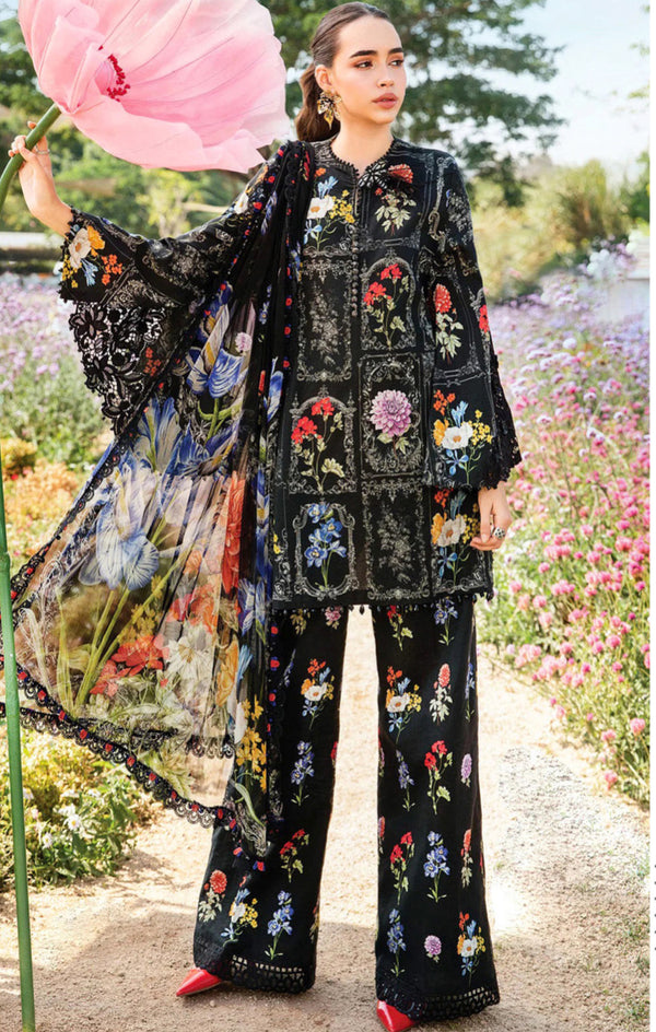 ShirtPrinted ShirtEmbroidered Organza PatchFabric: LAWNColor: BLACKDupattaPrinted DupattaFabric: SHAFOON DUPATTAColor: BLACKTrousers