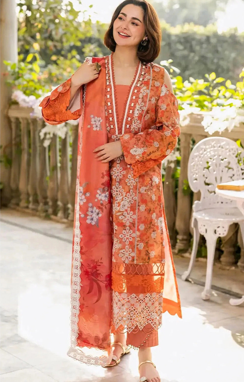 ShirtPrinted ShirtEmbroidered Organza PatchFabric: LAWNColor: ORANGEDupattaPrinted DupattaFabric: SHAFOON DUPATTAColor: ORANGETrousers