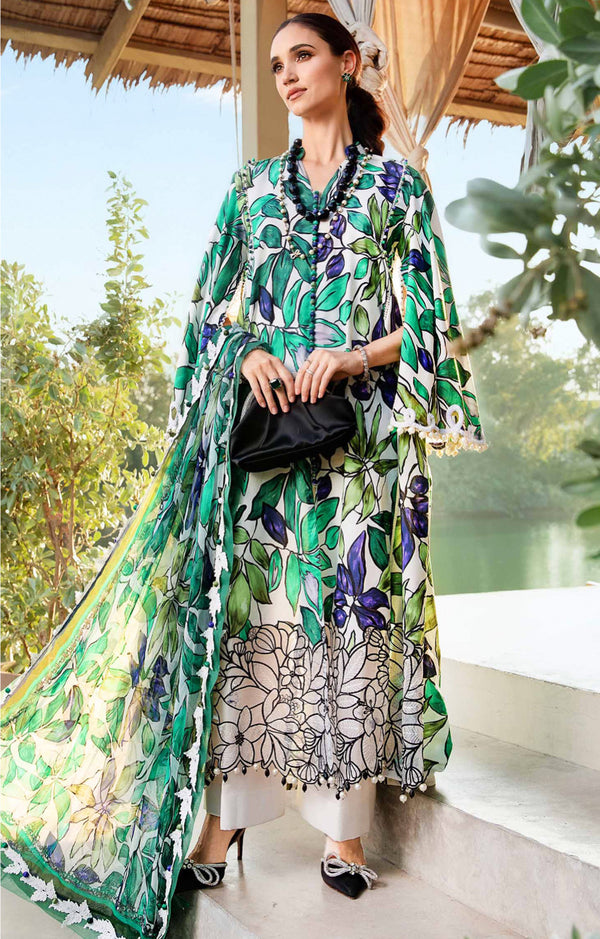 ShirtPrinted ShirtEmbroidered Organza PatchFabric: LAWNColor: OFF WHITEDupattaPrinted DupattaFabric: DIOMANDColor: OFF WHITETrousers