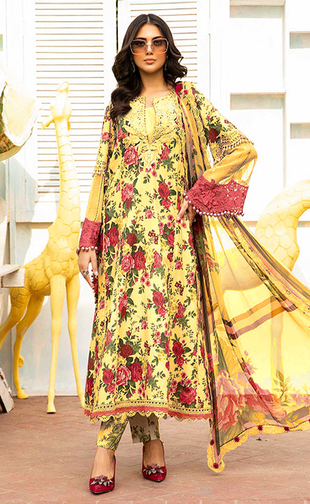 ShirtPrinted ShirtEmbroidered Organza PatchFabric: LAWNColor: YELLOWDupattaPrinted DupattaFabric: PRINTED COTTON NETColor: YELLOWTrousers